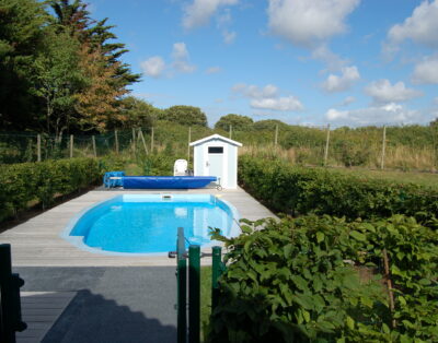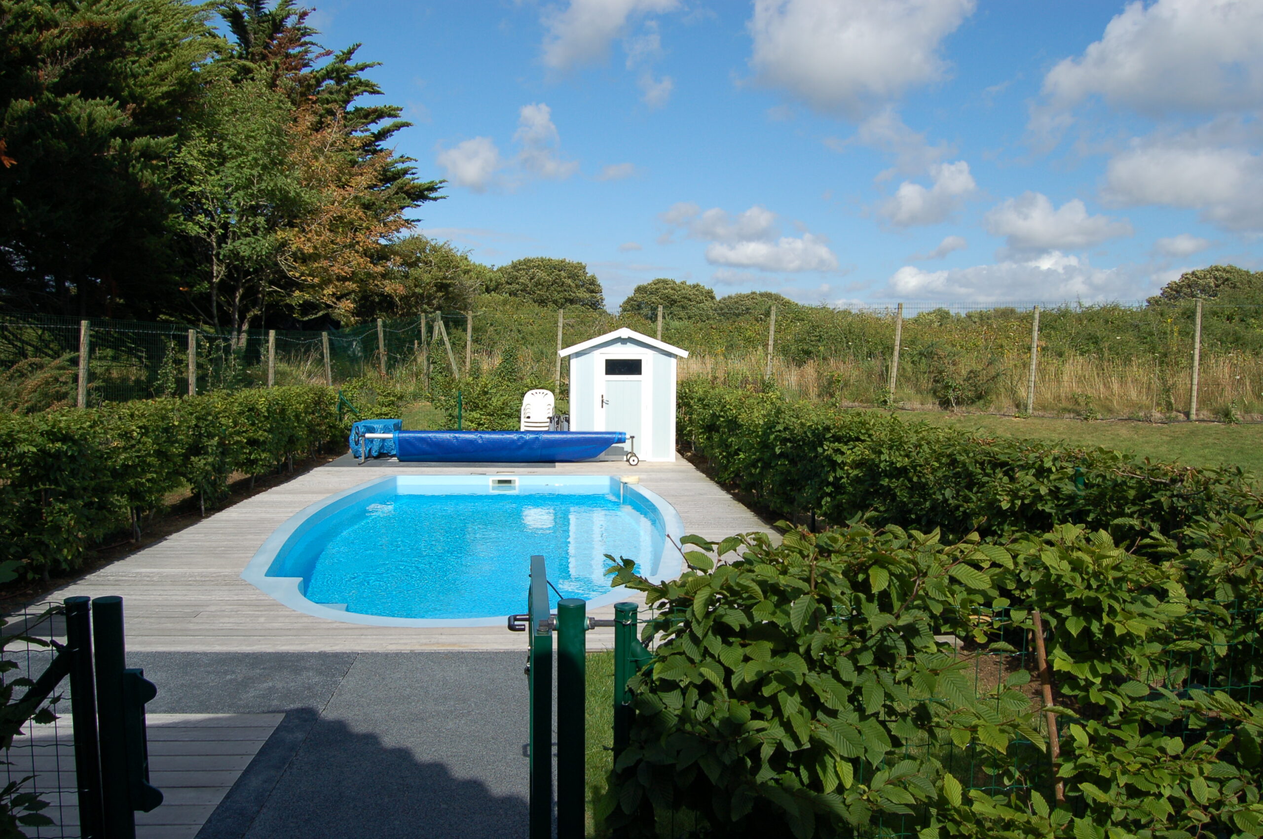 The private heated pool in the garden is fenced with a beech hedge. Next to the private pool are several sun loungers and an outdoor shower. The private pool has weekly cleaning.